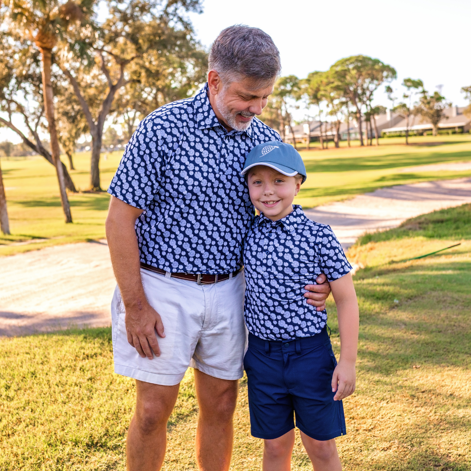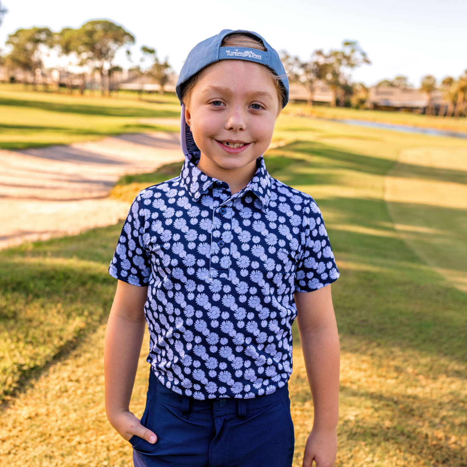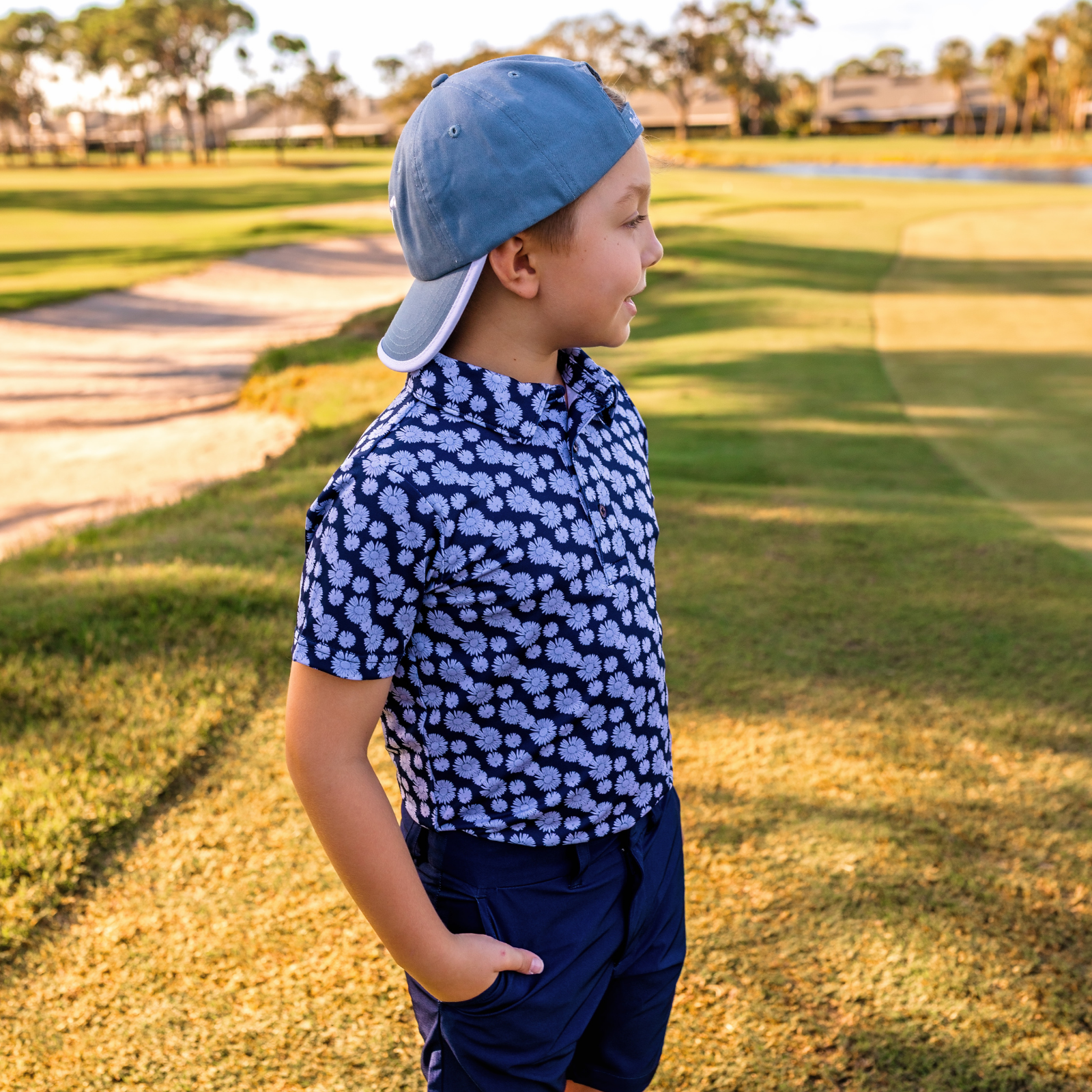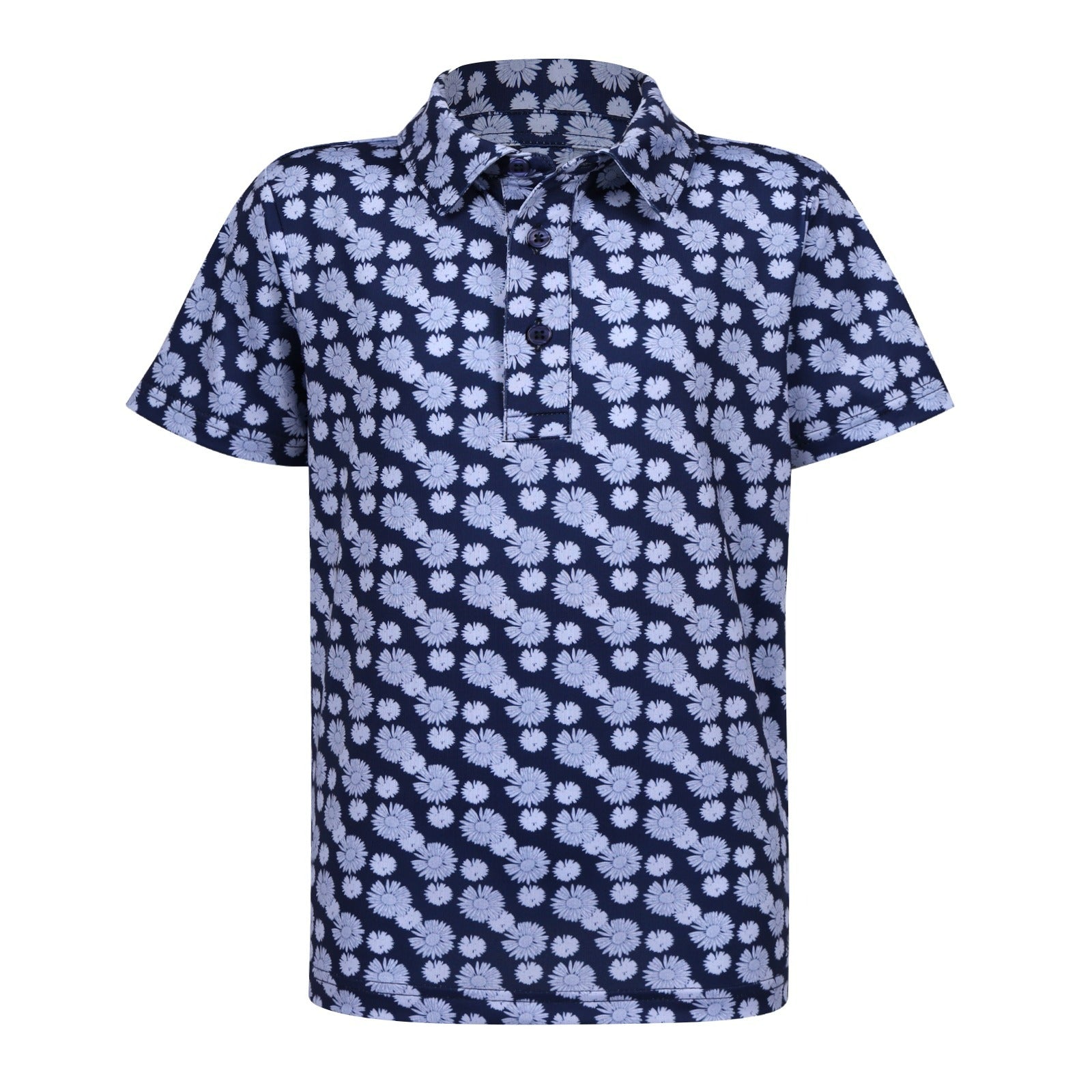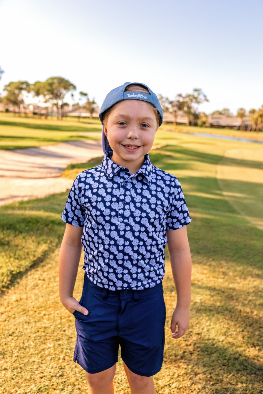 The Boys Archer Polo in Daisy Drive adds bold personality to boys golf clothes. Made with breathable stretch fabric and an athletic performance fit, this youth golf polo keeps young players comfortable through every round. The navy and blue colors adds vibrant style while performance fabric keeps kids cool on warm days. A perfect piece for junior golf tournaments and dad and me golf outfits.