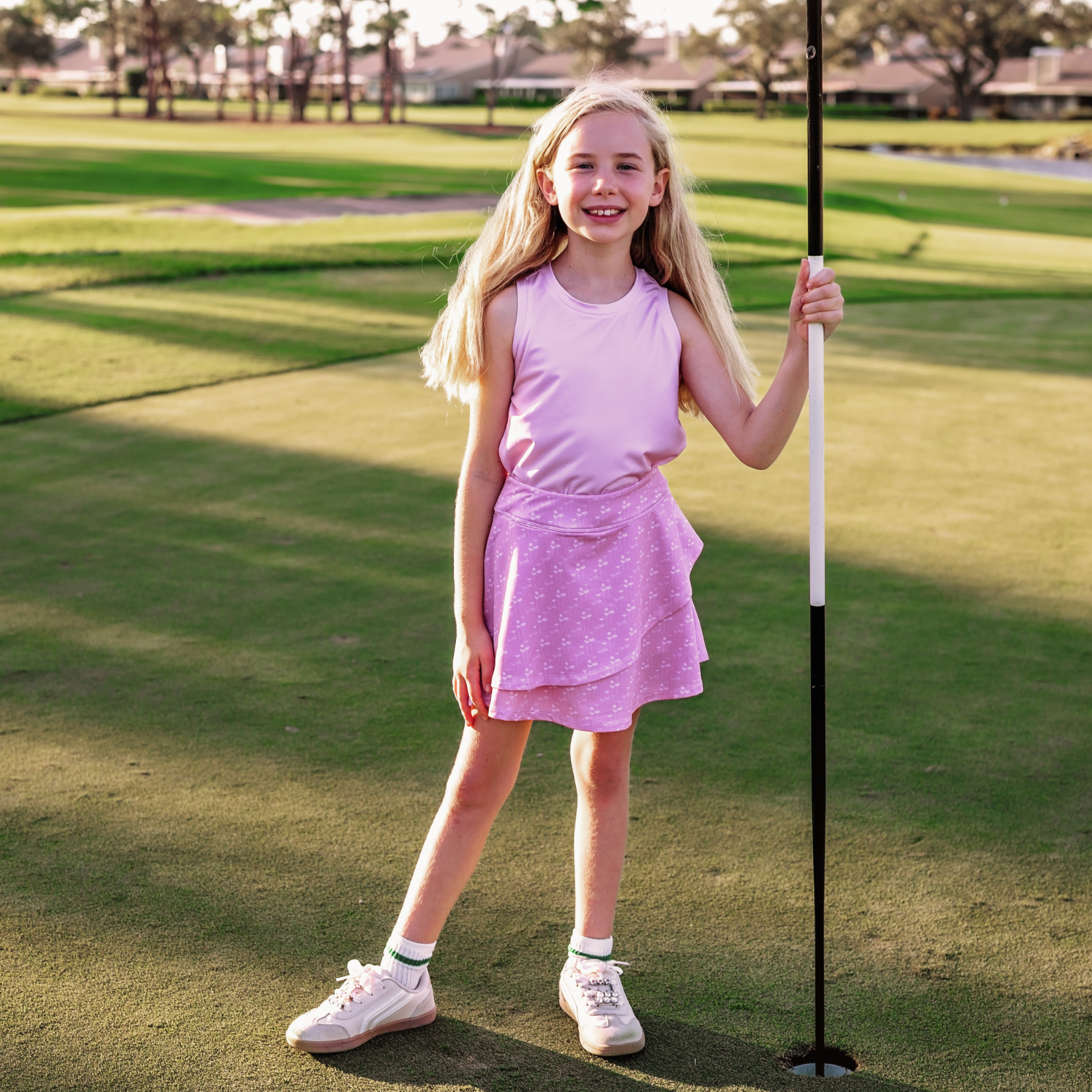 The Waverly Skort in Poppy print brings bright personality to girls golf apparel. Designed with a sporty pull-on fit and lightweight stretch fabric, this junior golf skort keeps girls comfortable through every swing. The Lotus pink colorway adds playful energy while built-in shorts provide confidence and coverage. Perfect for junior golf tournaments, golf practice, and summer club days, it’s a standout piece in any junior golf wardrobe.