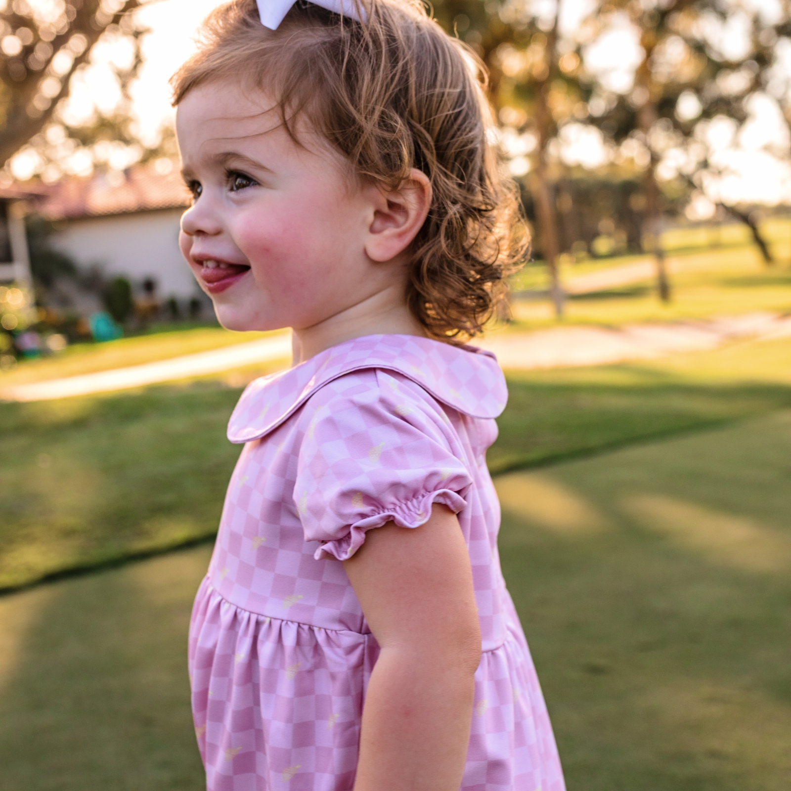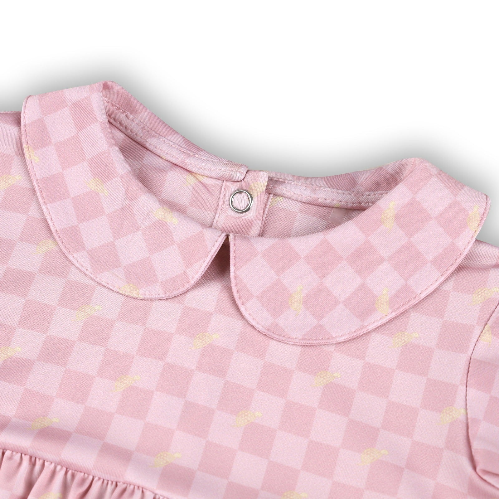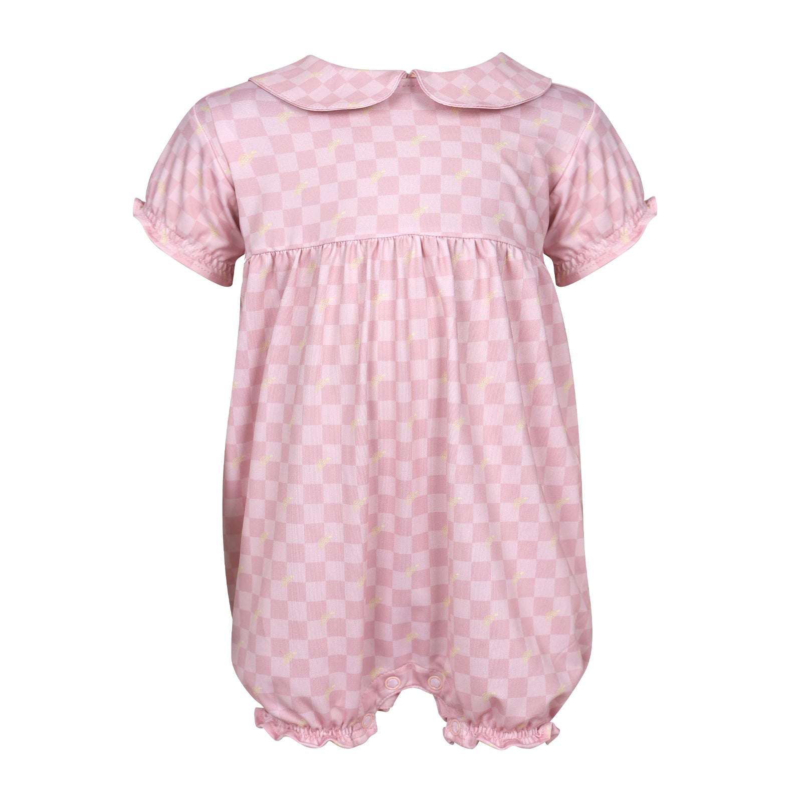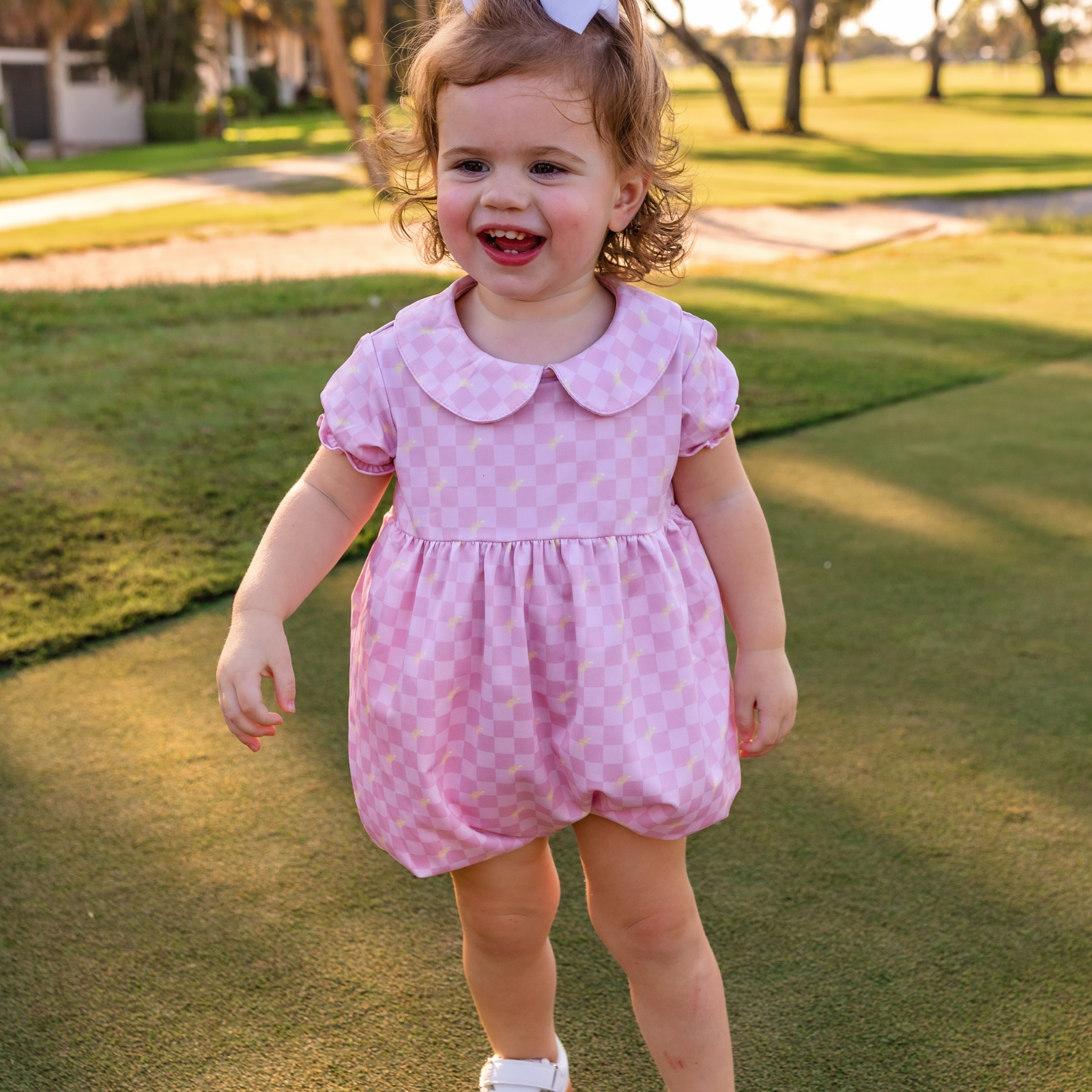 The Mini Kora Romper in Checkmate is a cute and comfortable piece of baby golf apparel designed for little golf fans. Featuring soft stretch performance fabric and puff sleeves, this toddler golf romper keeps babies comfortable while exploring the clubhouse or tagging along on family golf outings. The pink color adds playful charm, making it perfect for country club days, baby golf gifts, and matching sibling golf outfits.